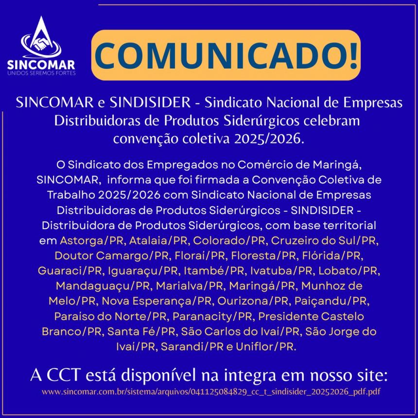 O Sindicato dos Empregados no Comércio de Maringá, SINCOMAR, informa que fechamos a Convenção Coletiva de Trabalho 2025/2026 com o SINDISIDER– SIND NACIONAL EMPR DISTRIBUIDORAS PRODUTOS SIDERURGICOS.Assim, lembramos dentre outras cláusulas as seguintes observações:1) O reajuste no salário dos empregados, será de 6,20% retroativo a junho/2025;2) R$ 56,00 a título de BONUS retroativos a...