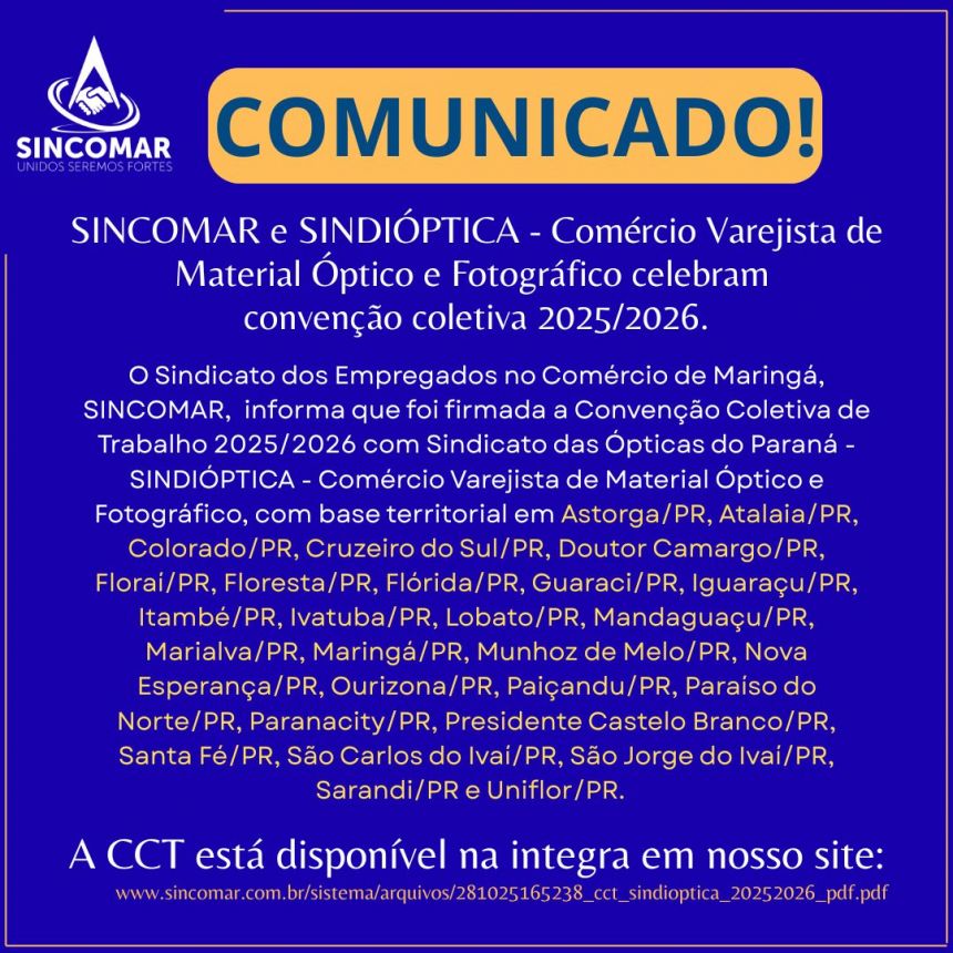 O Sindicato dos Empregados no Comércio de Maringá, SINCOMAR, informa que fechamos a Convenção Coletiva de Trabalho 2025/2026 com o SINDIÓPTICA – SINDICATO DO COMERCIO VAREJISTA DE MATERIAL OPTICO, FOTOGRAF. Assim, lembramos dentre outras cláusulas as seguintes observações:1) O reajuste no salário dos empregados, será de 6,20% retroativo a junho/2025;2) R$ 56,00 a título de BÔNUS...