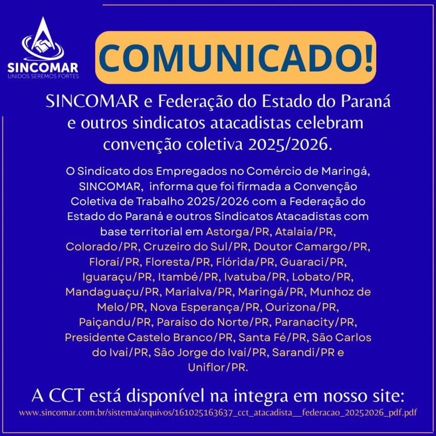 O Sindicato dos Empregados no Comércio de Maringá, SINCOMAR, informa que foi firmada a Convenção Coletiva de Trabalho 2023/2024 com a FEDERACAO DO COMERCIO DE BENS, SERVICOS E TURISMO DO PARANA, SINCAPR e OUTROS SINDICATOS ATACADISTAS. Observar COM ATENÇÃO as seguintes cláusulas que tiveram alterações:1) O reajuste no salário dos empregados, será de 6,20% retroativo a junho/2025;2)...